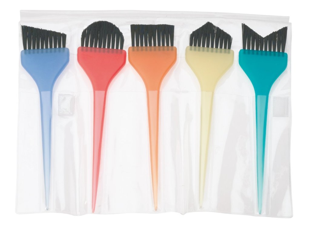 Sada pěti různě barevných a odlišně tvarovaných štětců pro barvení vlasů.